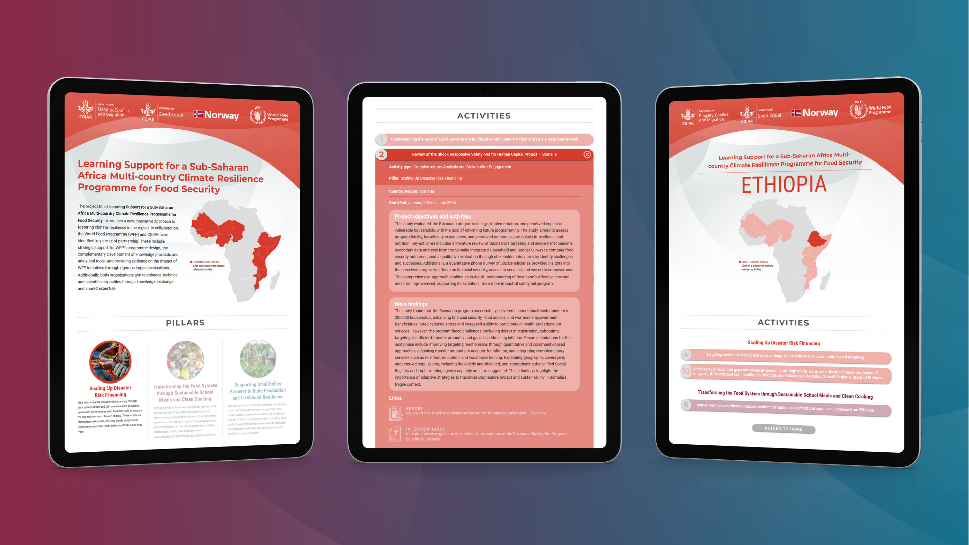 FCM’s research has been instrumental in enhancing WFP’s social protection strategies and school feeding programs across diverse contexts. In Somalia, CGIAR’s work provided critical insights for the Baxnaano safety net program—ensuring the next phase of the program is grounded in data-driven decision-making. The partnership informed the refinement of WFP’s approach to social protection, which helped shape the design of nutrition-sensitive interventions benefiting 1.2 million individuals, including 200,000 women. Similarly, in Kenya, CGIAR collaborated with WFP and the Kenyan government to evaluate the impact of their economic inclusion program. CGIAR worked with WFP on the evaluation design, to ensure its feasibility for WFP and that it addressed important evidence gaps, including those related to program sustainability and durability of impacts. Related work in Ethiopia and the Sahel region identified effective ways of targeting and integrating social protection and climate change adaptation strategies to enhance resilience. Altogether, this partnership generated important lessons to improve the targeting and design of national social protection programs as well as potential avenues to integrate these programs with development-oriented resilience-building and climate adaptations objectives.