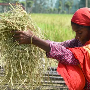 Photo credit: A woman farmer from Rangpur, Bangladesh is threshing her harvested rice, having received short duration Aman rice seeds and training from the Mixed Farming Systems Initiative, she efficiently separates grains from straw. Photo by Abdul Haque, IRRI