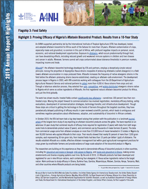 CGIAR researchers at IITA, the CGIAR Research Programs on Maize (MAIZE) and Agriculture for Nutrition and Health (A4NH) and partners adapted and improved the atoxigenic strain-based biocontrol technology for use in sub-Saharan Africa. Four native atoxigenic strains form the active ingredients of each country-specific biocontrol product, generically named Aflasafe. These are registered for commercial use and the technology is transferred to the private sector for scale-up.