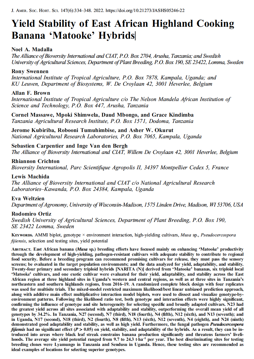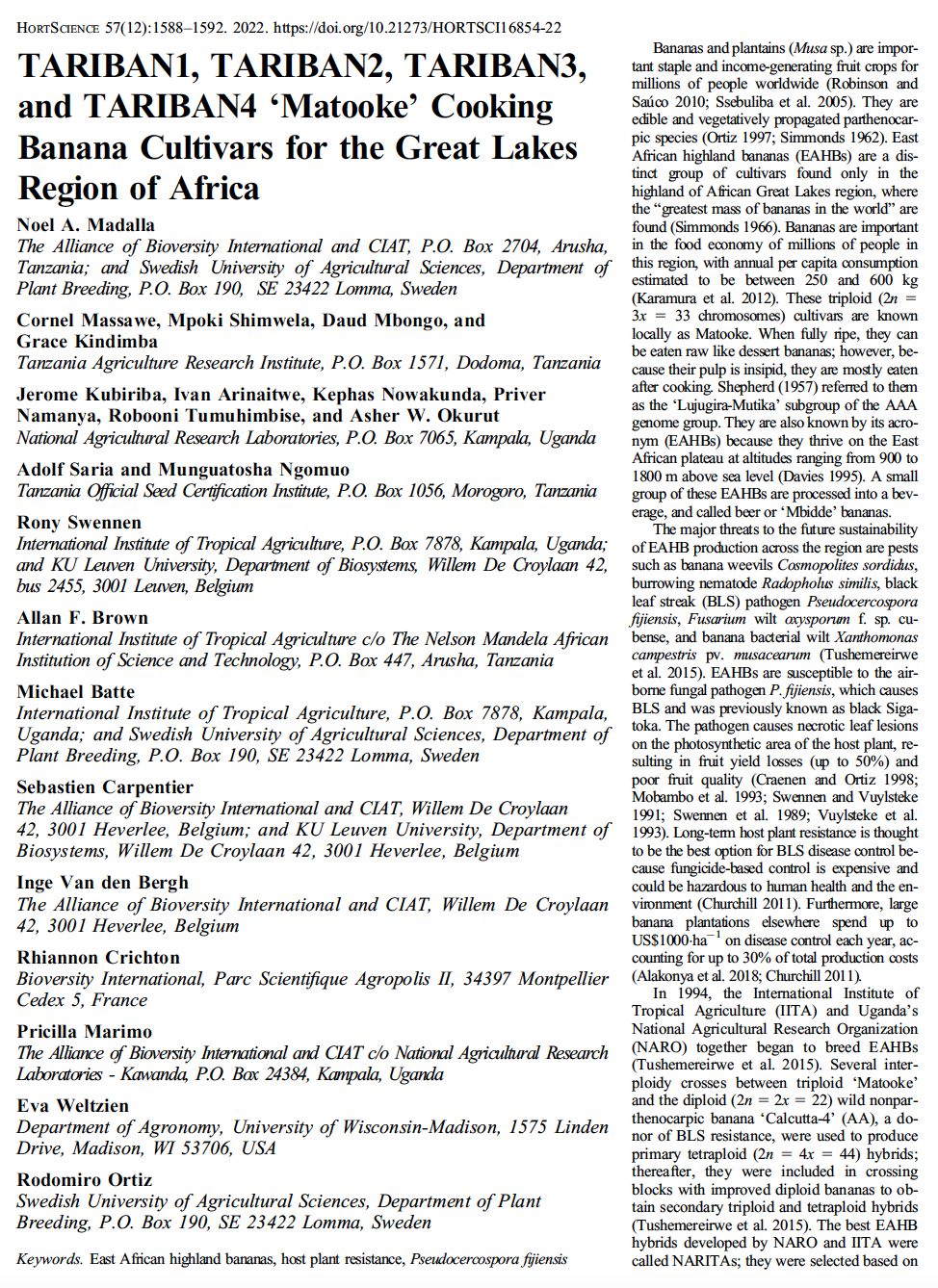 Building on this success, the researchers started a breeding program in the mid-1990s for matooke, a starchy highland banana that is a staple in Uganda. Together with the National Agricultural Research Organization (NARO) they were successful in producing high-yielding, resistant matooke hybrids.