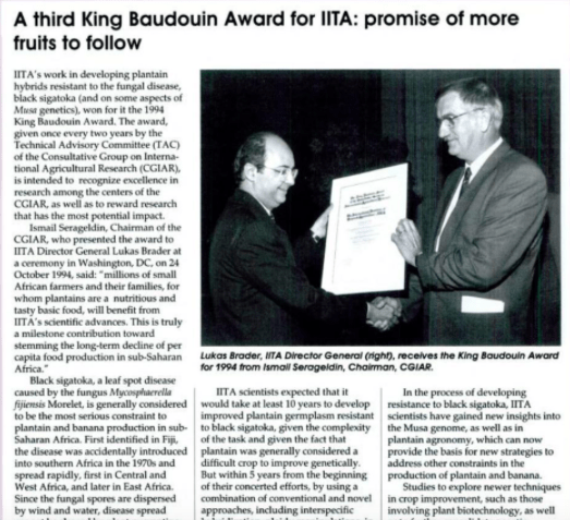 In 1987, CGIAR scientists at IITA finally found a way to breed several black-sigatoka-resistant plantain hybrids, demonstrating that banana breeding is in fact possible, through a combination of conventional and novel methods. Their achievement earned IITA the International King Badouin Award in 1994.