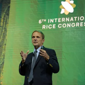16 October 2023, MANILA, Philippines ~ Collaborative action and advancement of direct-seeded rice can be an important solution for food security and climate change challenges facing the world, according to Michael Graham, head of Bayer’s Crop Science Research and Development Breeding Division, in his keynote speech on the first day of the 6th International Rice Congress.