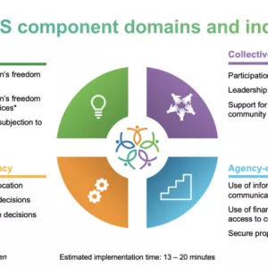 WEMNS is a streamlined tool intended for use in large-scale, multitopic surveys in both rural and urban areas and was designed to be added to existing surveys. Unlike previous metrics, WEMNS was designed to be relevant across a wide range of livelihood strategies and only takes 15 minutes to implement. Using a similar methodology as multidimensional poverty indexes, the tool has 12 indicators spread across four domains that can be used to calculate an overall index score or broken down by indicator, allowing for comparisons across sub-populations.