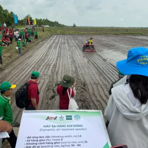 The CGIAR Initiatives on Excellence in Agronomy and Asian Mega-Deltas, in cooperation with the Department of Crop Production and Cuu Long Delta Rice Research Institute (CLRRI), conducted a field demonstration on mechanized direct-seeding in Can Tho City to promote new technology for increasing farming efficiency and reducing carbon footprint in rice production. More than 300 farmers from the Mekong River