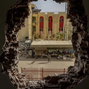 A Sudanese Armed Forces soldier walks past small stalls selling basic goods and some food, seen through a blast hole in the wall of the Aalia Specialist Hospital in Omdurman, Sudan. The hospital was under siege by the paramilitary Rapid Support Forces for months and heavily damaged in the process. [Photo Credit: Ivor Prickett/Panos Pictures] By Tarig Alhaj Rakhy, Shima Mohamed, Khalid Siddig, Hala