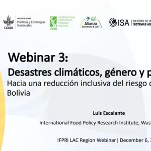 El 6 de diciembre de 2023 se llevó a cabo el tercer Webinar enmarcado en iniciativa de políticas y estrategias nacionales (NPS) en Colombia.,en colaboración con la Universidad de los Andes “Desastres climáticos, género y pobreza: Hacia una reducción inclusiva del riesgo de desastres en Bolivia”. Durante este seminario, se presentó el estudio realizado por Luis Escalante, investigador del IFPRI, como parte del curso “Instrumentos de Análisis de Política utilizando Modelos de Equilibrio General para Colombia”, El estudio, basado en datos de matrices de contabilidad social y encuestas de hogares, introdujo un modelo dinámico de equilibrio general computable (EGC). Los resultados destacan el impacto negativo de los desastres climáticos en el Producto Interno Bruto (PIB) de Bolivia, con una contracción del 1.5%. Además, se observó un aumento en los precios de los alimentos, una disminución en el consumo y un incremento de la pobreza, afectando especialmente a las mujeres.