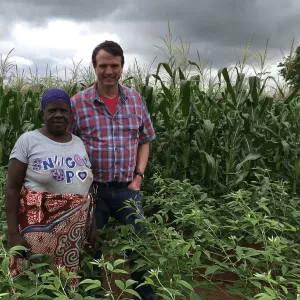 Elufe Chipande, a farmer at Songani in Zomba District, Malawi, is intercropping maize (background) and pigeonpea (foreground) under conservation agriculture practices to improve soil fertility and the capture and retention of rainwater. Christian Thierfelder (center), a cropping systems agronomist working out of the Zimbabwe office of CIMMYT, advises and supports southern African farmers and researchers to refine and spread diverse