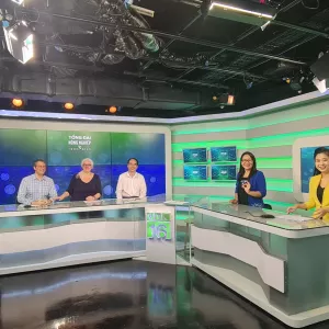 Header image: (left to right) Mark Lundy, SHiFT Deputy Lead; Inge Brouwer, SHiFT Lead; Associate Professor Dao The Anh, Vice President of Vietnam Academy of Agricultural Sciences; and Associate Professor Truong Tuyet Mai, Vice Director of the National Institute of Nutrition, prepare for their interview on VTC16 with Nguyen Phuong Thao, the talk show’s producer and scriptwriter, and MC Nguyen Tu Anh. Photo provided by VTC.