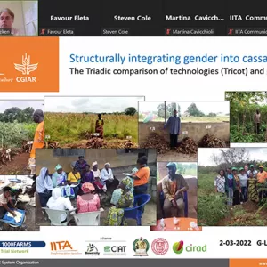 On 2 March, the first webinar entitled “Structurally integrating gender into cassava breeding: The Triadic comparison of technologies (Tricot) and prospects” was held. The meeting was successful, given the high number of attendees and their active feedback. Béla Teeken, Associate Social and Gender Scientist, presented with support from Olamide Olaosebikan – Senior Research Associate and Bello Abolore – Senior Research Supervisor. Steven Cole, Senior Gender specialist and GSN Coordinator, and Martina Cavicchioli, CIM Gender Scientist, moderated the session.