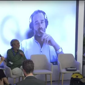 Photo credit: Ma. Eliza J. Villarino (left) talks with Souparna Lahiri (second from the left), Augusto Castro (middle, on the screen) and Marcos Nordgren (right) during the session on “How non-market approaches could look on the ground” at the Food and Agriculture Pavilion at COP28 in Dubai, UAE / CGIAR YouTube
