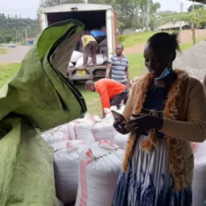 ‘This is our first time to produce this much beans. Previously, we produced small volumes of beans often sold locally. This time, our two stores are full of over 100 bags of beans and we can afford to call in an offtaker with a 10-ton lorry to buy the beans!’ she explains as she guides the group members on how to grade, pack and load the sacks on the truck.