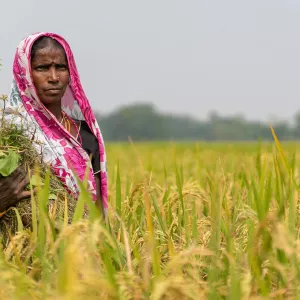 Header image: Farmer holding a bundle of harvested rice. Photo by IWMI.