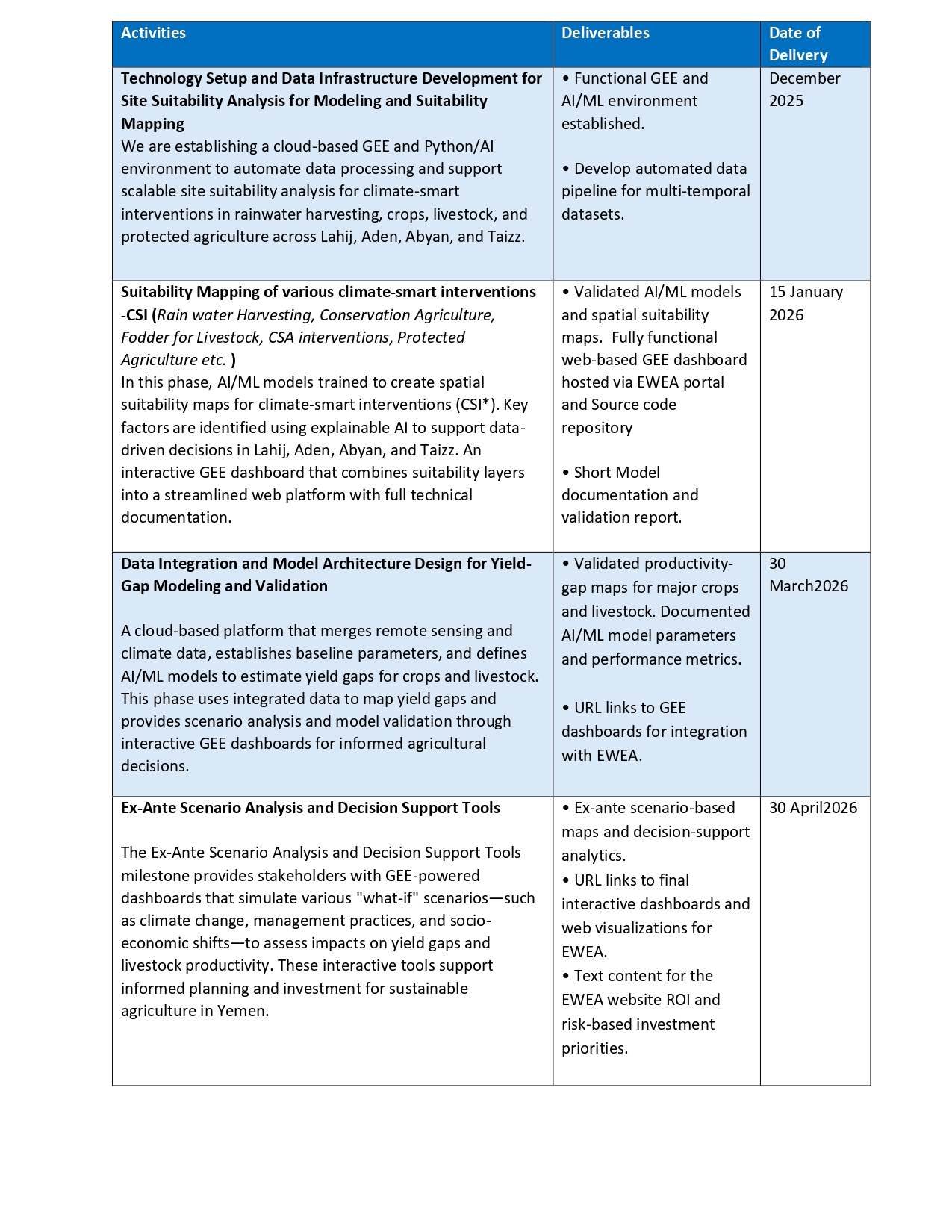 A key activity, Early Warning Early Action (EWEA) activity in this project, uses remote sensing and climate analytics to monitor environmental changes, assess climate risks, and support targeted interventions with site mapping via advanced geospatial methods. The adaptation of ICARDA’s GeoAgro platform provides localized, real-time advisories through a mobile app for farmers and dashboards for extension agents, enabling informed responses to climate challenges and enhancing rural resilience and food security in Yemen. A international consultant is sought for the climate analytics component of EWEA.