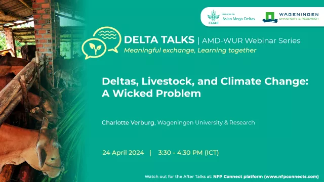 For the ninth installment of Delta Talks, the CGIAR Initiative on Asian Mega-Deltas (AMD) and Wageningen University & Research (WUR) presented a webinar on the impacts of climate change to the livestock sector in the deltas. Ms. Charlotte Verburg, a researcher at WUR, gave an insightful presentation titled Deltas, Livestock, and Climate Change: A Wicked Problem. She talked about the