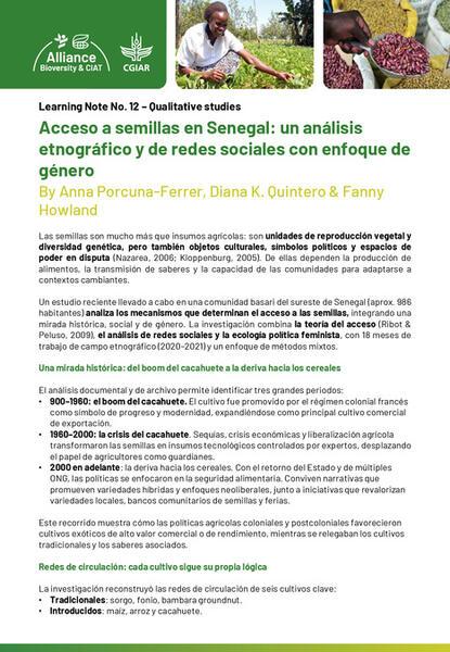 Esta investigación analiza cómo las dinámicas históricas, sociales y de género configuran el acceso a semillas en una comunidad basari del sureste de Senegal. Con 18 meses de trabajo de campo etnográfico (2020–2021), integra la teoría del acceso, el análisis de redes sociales y la ecología política feminista. Se identifican tres periodos: el auge del cacahuete (1900–1960), su crisis (1960–2000) y la deriva hacia los cereales desde 2000, impulsada por políticas de seguridad alimentaria. El estudio de seis cultivos muestra lógicas diferenciadas: el cacahuete circula por mercados y proyectos, el sorgo por lazos de parentesco y el bambara groundnut en redes solidarias entre mujeres. El género y la interseccionalidad resultan determinantes: las mujeres sostienen el sorgo, ocupan posiciones centrales en el bambara, pero enfrentan desigualdades en el acceso al arroz introducido por proyectos. En conjunto, se concluye que los nuevos cultivos y actores externos reconfiguran los lazos sociales y profundizan desigualdades, lo que obliga a entender la resiliencia agrícola como un proceso relacional, político e históricamente situado.