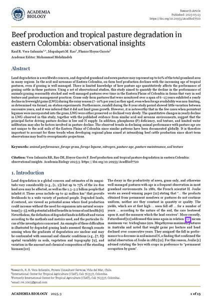 Land degradation is a worldwide concern, and degraded grassland and sown pasture may represent up to 60% of the total grassland area in many regions. In the acid-soil savannas of Eastern Colombia, on-farm beef production declines with the increasing age of tropical pastures, even if grazing is well managed. There is limited knowledge of how pasture age quantitatively affects the performance of grazing cattle in these pastures. Using a set of observational studies, this study aimed to quantify the decline in the performance of animals grazing reasonably stocked and well-managed pastures over time in the Eastern Plains of Colombia in farms that vary in soil texture and pasture management practices. Grass-only farm pastures that were monitored over a span of 6–15 years exhibited a yearly decline in liveweight gains (LWG) during the rainy season (7–10% per year) as they aged, even when forage availability was non-limiting, as determined via formal, on-station experiments. Furthermore, rainfall during the 8-year study period showed little variation between successive years, and it was inferred that it did not limit grass growth. However, it is noteworthy that in the few cases when persistent legumes were incorporated into the grass, LWG were either preserved or declined very slowly. The quantitative changes in yearly decline in LWG observed in this study, together with the published evidence from similar acid-soil savanna environments, suggest that the principal factor driving pasture decline is low soil N supply. In addition, phosphorus (P) deficiency, soil texture, and limited water infiltration may also be factors involved in pasture decline. The observed trends in declining animal performance with pasture age are not unique to the acid soils of the Eastern Plains of Colombia since similar patterns have been documented globally. It is therefore important to account for these trends when developing regional plans aimed at intensifying beef cattle production since short-term observations may lead to overoptimistic projections.