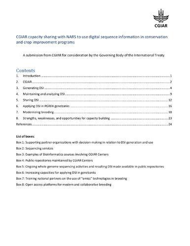 CGIAR submitted this report in response to the Plant Treaty Secretary's open request to Contracting Parties and stakeholders for information regarding their efforts ‘to reduce the existing gap on capacity between developed and developing countries’ regarding the use of digital sequence information/genomic sequence information (DSI/GSD).