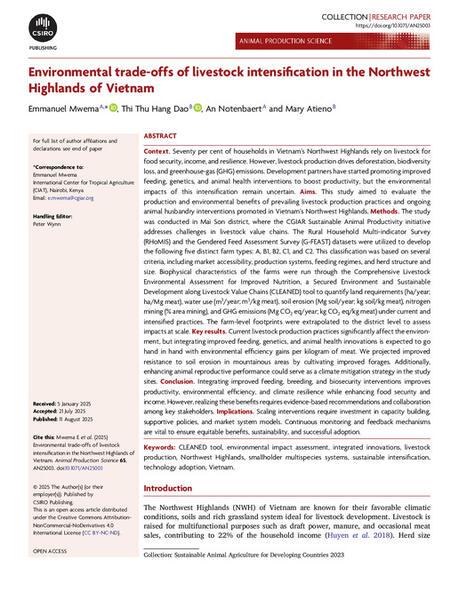 Context Seventy per cent of households in Vietnam’s Northwest Highlands rely on livestock for food security, income, and resilience. However, livestock production drives deforestation, biodiversity loss, and greenhouse-gas (GHG) emissions. Development partners have started promoting improved feeding, genetics, and animal health interventions to boost productivity, but the environmental impacts of this intensification remain uncertain. Aims This study aimed to evaluate the production and environmental benefits of prevailing livestock production practices and ongoing animal husbandry interventions promoted in Vietnam’s Northwest Highlands. Methods The study was conducted in Mai Son district, where the CGIAR Sustainable Animal Productivity initiative addresses challenges in livestock value chains. The Rural Household Multi-indicator Survey (RHoMIS) and the Gendered Feed Assessment Survey (G-FEAST) datasets were utilized to develop the following five distinct farm types: A, B1, B2, C1, and C2. This classification was based on several criteria, including market accessibility, production systems, feeding regimes, and herd structure and size. Biophysical characteristics of the farms were run through the Comprehensive Livestock Environmental Assessment for Improved Nutrition, a Secured Environment and Sustainable Development along Livestock Value Chains (CLEANED) tool to quantify land requirements (ha/year; ha/Mg meat), water use (m3/year; m3/kg meat), soil erosion (Mg soil/year; kg soil/kg meat), nitrogen mining (% area mining), and GHG emissions (Mg CO2 eq/year; kg CO2 eq/kg meat) under current and intensified practices. The farm-level footprints were extrapolated to the district level to assess impacts at scale. Key results Current livestock production practices significantly affect the environment, but integrating improved feeding, genetics, and animal health innovations is expected to go hand in hand with environmental efficiency gains per kilogram of meat. We projected improved resistance to soil erosion in mountainous areas by cultivating improved forages. Additionally, enhancing animal reproductive performance could serve as a climate mitigation strategy in the study sites. Conclusion Integrating improved feeding, breeding, and biosecurity interventions improves productivity, environmental efficiency, and climate resilience while enhancing food security and income. However, realizing these benefits requires evidence-based recommendations and collaboration among key stakeholders. Implications Scaling interventions require investment in capacity building, supportive policies, and market system models. Continuous monitoring and feedback mechanisms are vital to ensure equitable benefits, sustainability, and successful adoption.