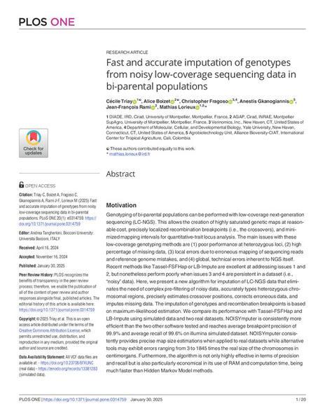 Genotyping of bi-parental populations can be performed with low-coverage next-generation sequencing (LC-NGS). This allows the creation of highly saturated genetic maps at reasonable cost, precisely localized recombination breakpoints (i.e., the crossovers), and minimized mapping intervals for quantitative-trait locus analysis. The main issues with these low-coverage genotyping methods are (1) poor performance at heterozygous loci, (2) high percentage of missing data, (3) local errors due to erroneous mapping of sequencing reads and reference genome mistakes, and (4) global, technical errors inherent to NGS itself. Recent methods like Tassel-FSFHap or LB-Impute are excellent at addressing issues 1 and 2, but nonetheless perform poorly when issues 3 and 4 are persistent in a dataset (i.e., “noisy” data). Here, we present a new algorithm for imputation of LC-NGS data that eliminates the need of complex pre-filtering of noisy data, accurately types heterozygous chromosomal regions, precisely estimates crossover positions, corrects erroneous data, and imputes missing data. The imputation of genotypes and recombination breakpoints is based on maximum-likelihood estimation. We compare its performance with Tassel-FSFHap and LB-Impute using simulated data and two real datasets. NOISYmputer is consistently more efficient than the two other software tested and reaches average breakpoint precision of 99.9% and average recall of 99.6% on illumina simulated dataset. NOISYmputer consistently provides precise map size estimations when applied to real datasets while alternative tools may exhibit errors ranging from 3 to 1845 times the real size of the chromosomes in centimorgans. Furthermore, the algorithm is not only highly effective in terms of precision and recall but is also particularly economical in its use of RAM and computation time, being much faster than Hidden Markov Model methods. Availability NOISYmputer and its source code are available as a multiplatform (Linux, macOS, Windows) Java executable at the URL https://gitlab.cirad.fr/noisymputer/noisymputerstandalone/-/tree/1.0.0-… .