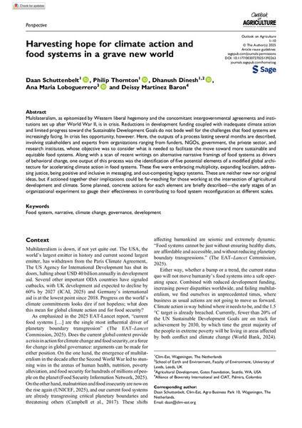 Multilateralism, as epitomized by Western liberal hegemony and the concomitant intergovernmental agreements and institutions set up after World War II, is in crisis. Reductions in development funding coupled with inadequate climate action and limited progress toward the Sustainable Development Goals do not bode well for the challenges that food systems are increasingly facing. In crisis lies opportunity, however. Here, the outputs of a process lasting several months are described, involving stakeholders and experts from organizations ranging from funders, NGOs, government, the private sector, and research institutes, whose objective was to consider what is needed to facilitate the move toward more sustainable and equitable food systems. Along with a scan of recent writings on alternative narrative framings of food systems as drivers of behavioral change, one output of this process was the identification of five potential elements of a modified global architecture for accelerating climate action in food systems. These five were embracing multiplicity, expanding localism, addressing justice, being positive and inclusive in messaging, and out-competing legacy systems. These are neither new nor original ideas, but if actioned together their implications could be far-reaching for those working at the intersection of agricultural development and climate. Some planned, concrete actions for each element are briefly described—the early stages of an organizational experiment to gauge their effectiveness in contributing to food system reconfiguration at different scales.