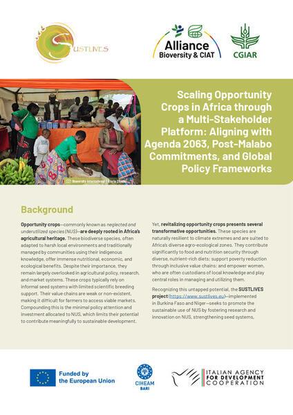 This policy brief presents the African Opportunity Crops Working Group—a multi-stakeholder platform established under the African Union’s African Seed and Biotechnology Platform (ASBP). Led by the Alliance of Bioversity International and CIAT, with the Forum for Agricultural Research in Africa (FARA) and the World Vegetable Center as co-leads, the Working Group serves as a coordination mechanism to scale up and mainstream opportunity crops across Africa. It does this in alignment with key continental frameworks such as the Post-Malabo Declaration and the African Union’s Agenda 2063. Through a coordinated and inclusive approach, the Working Group aims to foster innovation, policy coherence, and investment to strengthen food and nutrition security, enhance climate resilience, and advance Africa’s long-term socio-economic transformation. Learn more about the Working Group here: https://hdl.handle.net/10568/176847